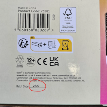 De batchcode staat rechtsonder op de achterzijde van de verpakking en ook op één blokje per set onder het Tickit-logo.