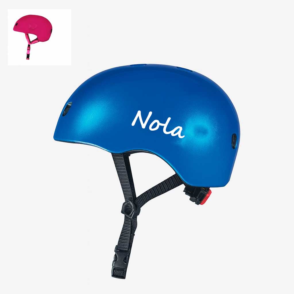 De Micro helm Deluxe met naam is verkrijgbaar in twee populaire kleuren: roze en blauw. De naam van je kind wordt standaard op beide zijden van de helm bedrukt. Je kunt kiezen uit verschillende lettertypes en kleuren voor de naamopdruk. Wil je de naam ergens anders laten bedrukken? Dat is mogelijk, geef dan je wensen aan bij de opmerkingen.