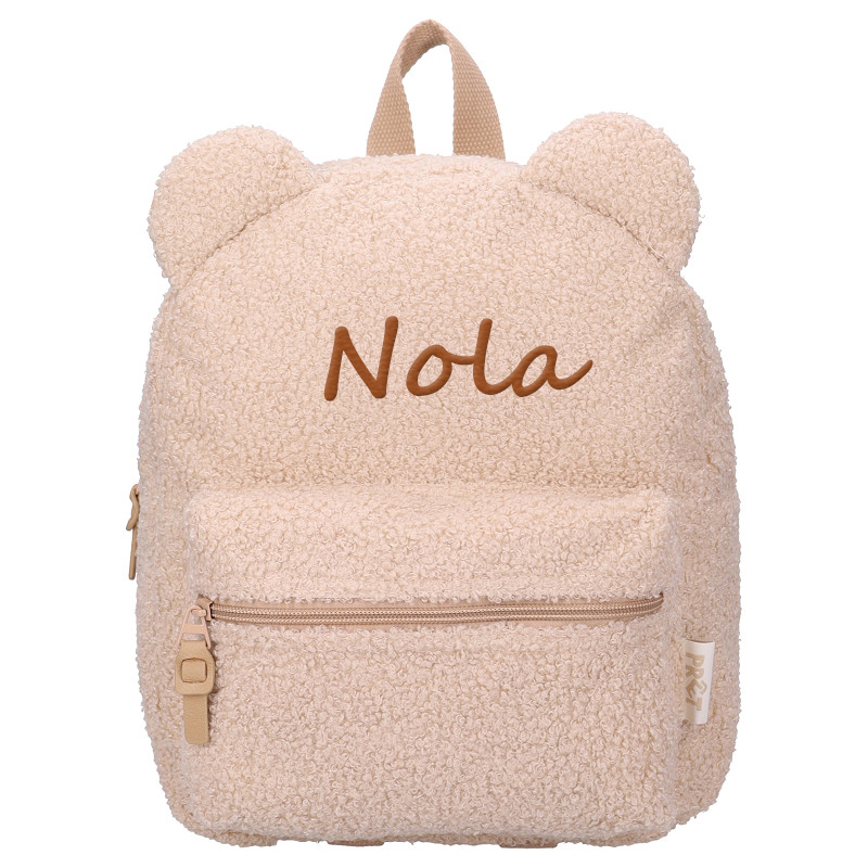 Het unieke aan deze rugzak is de mogelijkheid om hem te personaliseren. De naam wordt geborduurd boven de rits, netjes afgewerkt en ongeveer acht tot negen centimeter breed. Je kunt zelf een borduurkleur en lettertype kiezen, zodat de personalisatie mooi contrasteert met de effen teddy kleur van de rugzak. Omdat de tas een rustige, zachte basiskleur heeft, komt een borduring bijzonder mooi uit en oogt de rugzak direct luxer dan standaard rugzakjes die alleen bedrukt worden. Voor de beste leesbaarheid raden we aan om alleen een voornaam te gebruiken. Dit houdt de borduring strak, duidelijk en in verhouding tot het rugzakje.