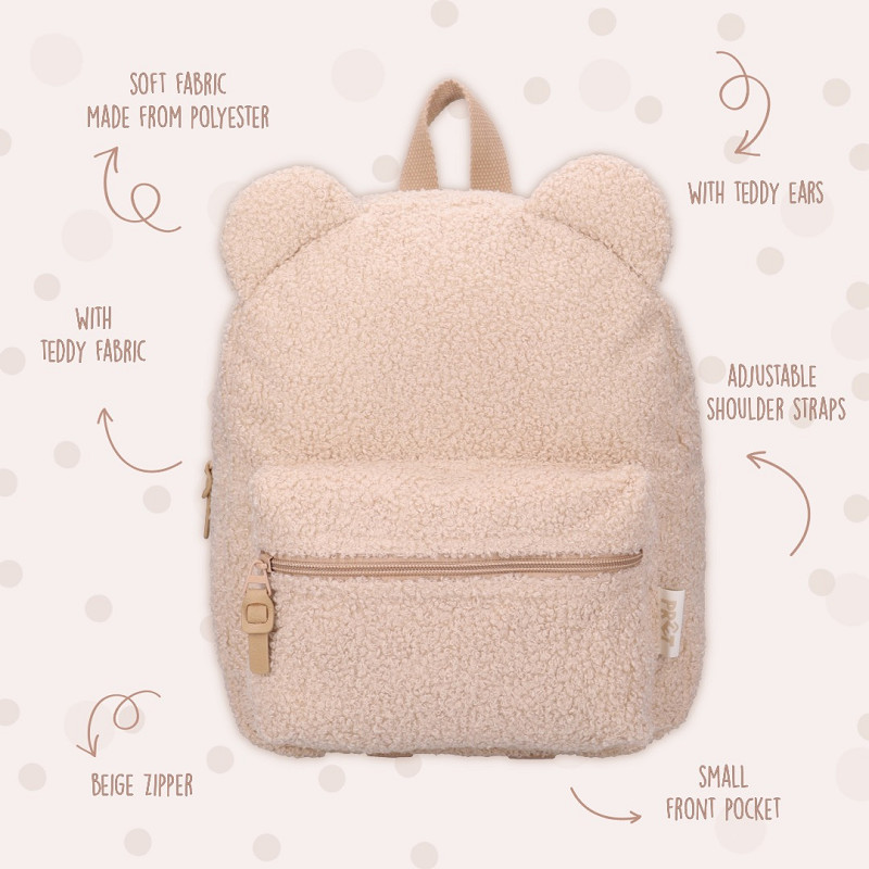 Het voorvak is ideaal om kleine spullen zoals snacks, een speen, sleuteltjes of een favoriet knuffeltje in op te bergen. De rugzak is licht van gewicht en heeft een compact formaat, waardoor kinderen hem makkelijk zelf kunnen dragen. Door het zachte teddy materiaal voelt de rugzak warm, knuffelig en extra comfortabel aan – een groot pluspunt ten opzichte van gewone canvas of nylon kinderrugzakken die je bij andere aanbieders ziet.