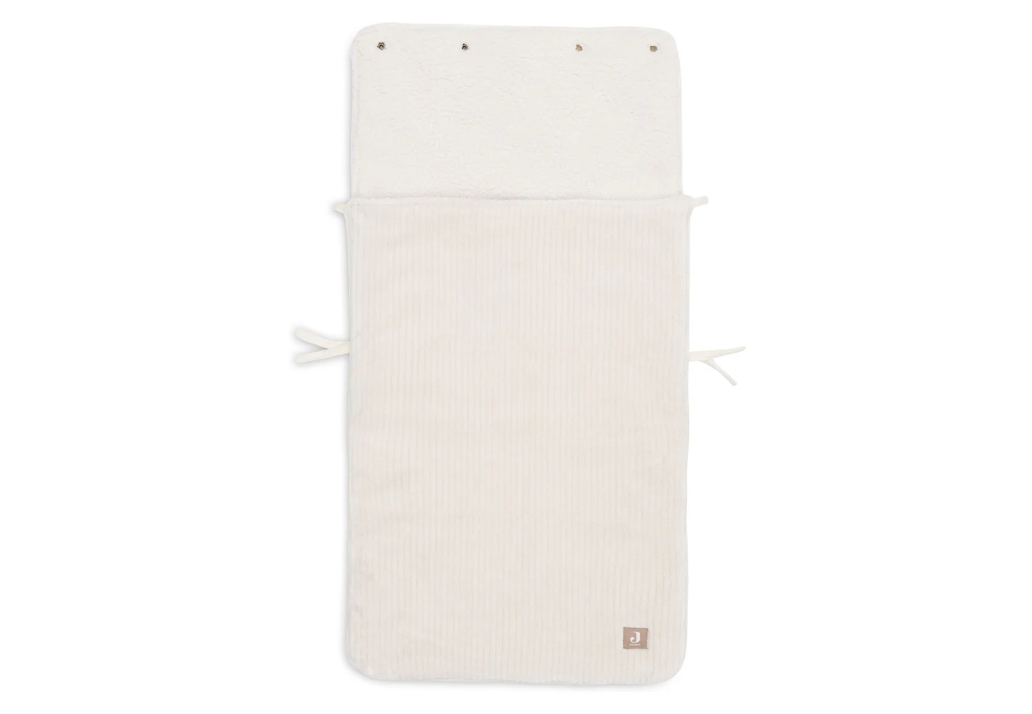 De voetenzak is gemaakt van 100% polyester. De buitenkant heeft een luxe ribstof en de binnenkant is voorzien van een zachte teddy voering voor extra warmte en comfort.